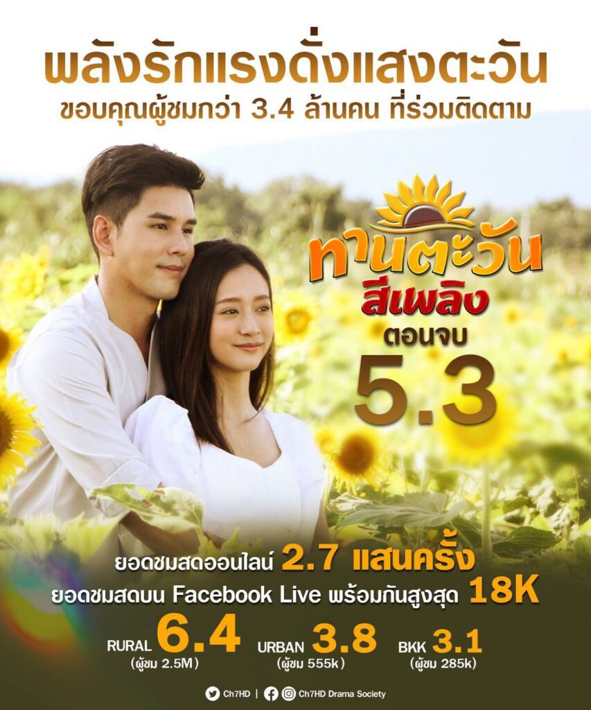 เข้มข้นครบรสมาจนถึงบทสรุปกันเลยทีเดียว สำหรับละครเรื่อง ทานตะวันสีเพลิง ทางช่อง 7HD ที่ปิดท้ายตอนจบด้วยฉากโรแมนติกฟิน ๆ ส่งผลให้เรตติ้งสูงถึง 5.3 ผู้ชมกว่า 3.4 ล้านคน (ข้อมูลวันที่ 25 สิงหาคม 2564) งานนี้ พระ นาง อั๋น-อัครพรรฒ บุนนาค และ ชิงชิง-คริษฐา สังสะโอภาส เปิดใจ ขอขอบคุณแฟนละคร ที่ติดตามชมกันมาอย่างต่อเนื่อง