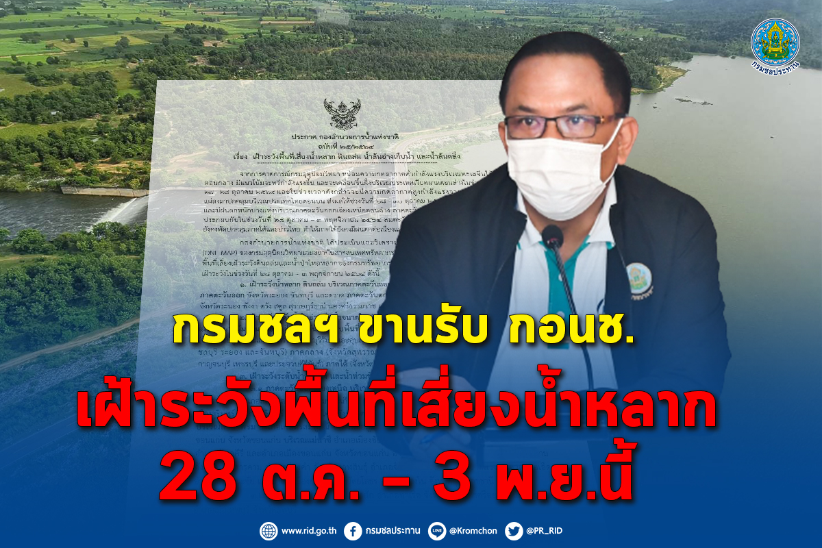 ตามประกาศกองอำนวยการน้ำแห่งชาติ ฉบับที่ 25/2564 เรื่อง “เฝ้าระวังพื้นที่เสี่ยงน้ำหลาก ดินถล่ม น้ำล้นอ่างเก็บน้ำ และน้ำล้นตลิ่ง” จากการคาดการณ์กรมอุตุนิยมวิทยา หย่อมความกดอากาศต่ำกำลังแรงบริเวณทะเลจีนใต้ตอนกลาง มีแนวโน้มจะทวีกำลังแรงขึ้น และจะเคลื่อนขึ้นฝั่งบริเวณประเทศเวียดนามตอนล่างในช่วงวันที่ 27 – 28 ตุลาคม 2564 นี้ และในช่วงเวลาดังกล่าวจะมีความกดอากาศสูงกำลังแรงจากประเทศจีนแผ่ลงมาปกคลุมบริเวณประเทศไทยตอนบน ส่งผลให้ช่วงวันที่ 28 – 30 ตุลาคม 2564 มีฝนตกปานกลาง และมีฝนตกหนักบางแห่งบริเวณภาคตะวันออกเฉียงเหนือตอนล่าง ภาคตะวันออก และภาคกลางบางส่วน ประกอบกับในช่วงวันที่ 28 ตุลาคม – 3 พฤศจิกายน 2564 ลมตะวันออกและลมตะวันออกเฉียงเหนือยังคงพัดปกคลุมภาคใต้และอ่าวไทย ทำให้ภาคใต้ยังคงมีฝนตกต่อเนื่องและมีฝนตกหนักบางแห่ง