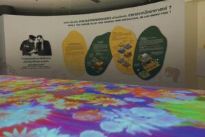 กับพิพิธภัณฑ์การเกษตร ตั้งแต่เริ่มต้น จนถึงอนาคตภายในพิพิธภัณฑ์กษัตริย์เกษตร 2.นิทรรศการโซนตามรอยพ่อ อยู่อย่างพอเพียง : พาไปทำความรู้จักกับคำว่าเศรษฐกิจพอเพียง และต้นแบบแห่งความพอเพียง “พอ” แบบไหนคือพอเพียง 3.นิทรรศการโซนน้ำคือชีวิต ถ่ายทอดเรื่องราวของการจัดการน้ำอย่างยั่งยืน ร้อยเรียงตั้งแต่ ความสำคัญของน้ำ พระอัจฉริยภาพของกษัตริย์เกษตร ในด้านการจัดการน้ำ และวิธีอนุรักษ์น้ำ 4.นิทรรศการโซนหัวใจใฝ่เกษตร “Virtual Reality Game 1 ไร่ พึ่งตนเอง” พาไปลงมือทำการเกษตรทฤษฎีใหม่ตามหลักปรัชญาของเศรษฐกิจพอเพียงในรูปแบบเสมือนจริง Virtual Reality game ภายในพิพิธภัณฑ์ในหลวงรักเรา