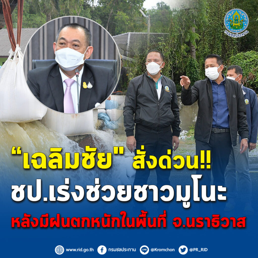 ดร.เฉลิมชัย ศรีอ่อน รัฐมนตรีว่าการกระทรวงเกษตรและสหกรณ์ สั่งการให้กรมชลประทาน เร่งเสริมความมั่นคงแข็งแรงประตูระบายน้ำมูโนะ จ.นราธิวาส หลังมีฝนตกหนักในพื้นที่ลุ่มน้ำโก-ลก ส่งผลระดับสูงขึ้น จนเอ่อล้นข้ามคันประตูระบายน้ำมูโนะ ทำให้เกิดน้ำเอ่อล้นคลองมูโน๊ะเข้าท่วมพื้นที่ลุ่มต่ำเป็นบางแห่ง เบื้องต้นได้สั่งการให้นำบิ๊กแบ็ค(Big bag) และกระสอบทรายเสริมคัน เพื่อสร้างความมั่นคงแข็งแรงให้กับประตูระบายน้ำ ช่วยบรรเทาความเดือดร้อนให้กับชาวบ้านได้ในระดับหนึ่งแล้ว