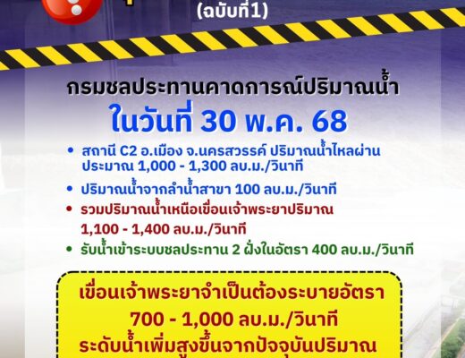 ศูนย์ปฏิบัติการน้ำอัจฉริยะ(SWOC) กรมชลประทาน คาดการณ์ว่าในอีก 1-3 วัน ข้างหน้า ที่สถานีวัดน้ำ C.2 อ.เมืองนครสวรรค์ จะมีปริมาณน้ำไหลผ่านประมาณ 1,300 – 1,400 ลบ.ม./วินาที ก่อนจะไหลมารวมกับน้ำที่มาจากลำน้ำสาขา ที่คาดว่าจะอยู่ในเกณฑ์ประมาณ 200 – 250 ลบ.ม./วินาที จะส่งผลทำให้ปริมาณน้ำบริเวณเหนือเขื่อนเจ้าพระยา อยู่ในเกณฑ์ระหว่าง 1,500 – 1,650 ลบ.ม./วินาที โดยจะกระจายน้ำเข้าระบบชลประทานทั้ง 2 ฝั่งของแม่น้ำเจ้าพระยา รวมกันประมาณ 400 ลบ.ม./วินาที พร้อมกับปรับเพิ่มการระบายน้ำผ่านท้ายเขื่อนเจ้าพระยา ในอัตราระหว่าง 1,000 – 1,500 ลบ.ม./วินาที ซึ่งจะส่งผลให้ระดับน้ำท้ายเขื่อน บริเวณพื้นที่ลุ่มต่ำนอกคันกั้นน้ำ บริเวณคลองโผงเผง จ.อ่างทอง คลองบางบาล จ.พระนครศรีอยุธยา และตำบลหัวเวียง อ.เสนา ต.ลาดชิด ต.ท่าดินแดง อ.ผักไห่ จ.พระนครศรีอยุธยา (แม่น้ำน้อย) เพิ่มสูงขึ้นอีกประมาณ 0.50 – 1.30 เมตร