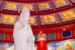 องค์พระโพธิสัตว์กวนอิม เป็นหนึ่งในเทพเจ้าที่เป็นที่เคารพนับถือของคนไทย คนจีน และคนไทยเชื้อสายจีน เป็นพระโพธิสัตว์ตามคติความเชื่อของพุทธศาสนานิกายมหายาน เป็นองค์เดียวกันกับพระอวโลกิเตศวรโพธิสัตว์ มีต้นกำเนิดมาจากพระสูตรมหายานในอินเดีย ตำนานความเชื่อของชาวจีนเชื่อกันว่า พระโพธิสัตว์กวนอิม เดิมเป็นเทพธิดาที่ต้องการช่วยปลดเปลื้องทุกข์ภัยแก่มวลมนุษย์ในชาติสุดท้าย จึงจุติลงมายังโลกมนุษย์ในนามของเจ้าหญิงเมี่ยวซ่าน ทรงเป็นพุทธมามกะที่รู้แจ้งในหลักธรรมอย่างลึกซึ้ง ต่อมามีความขัดแย้งกับพระบิดาจนถึงกับถูกสั่งประหารชีวิต แต่มีเทวดามาช่วยไว้และเจ้าหญิงเมี่ยวซ่านได้บำเพ็ญเพียรจนบรรลุมรรคผลสำเร็จธรรมในที่สุด