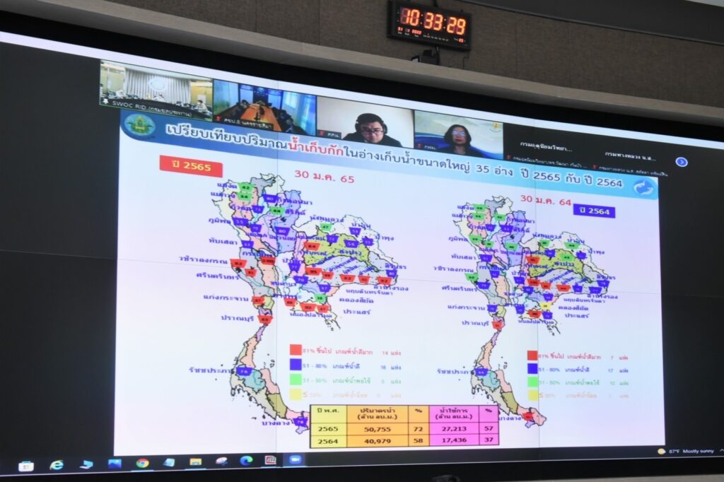 เช้าวันนี้ (31 ม.ค.65) ที่ศูนย์ปฏิบัติการน้ำอัจฉริยะ(SWOC) กรมชลประทาน นายปกรณ์ สุตสุนทร ผู้เชี่ยวชาญด้านที่ปรึกษาอุทกวิทยา เป็นประธานการประชุมคณะอนุกรรมการติดตามและวิเคราะห์แนวโน้มสถานการณ์น้ำ ผ่านระบบ Video Conference ไปยังสำนักงานชลประทานที่ 1-17 และหน่วยงานที่เกี่ยวข้อง อาทิ กรมอุตุนิยมวิทยา กรมทรัพยากรน้ำ กรมป้องกันและบรรเทาสาธารณภัย สำนักการระบายน้ำ(กทม.) การไฟฟ้าฝ่ายผลิตแห่งประเทศไทย(กฟผ.) และผู้เกี่ยวข้อง เข้าร่วมประชุม เพื่อติดตามและวิเคราะห์สถานการณ์น้ำในอ่างเก็บน้ำ แหล่งน้ำ และแม่น้ำสายหลักต่าง ๆ สำหรับเป็นข้อมูลในการบริหารจัดการน้ำให้สอดคล้องและเหมาะสมกับสถานการณ์ในแต่ละพื้นที่