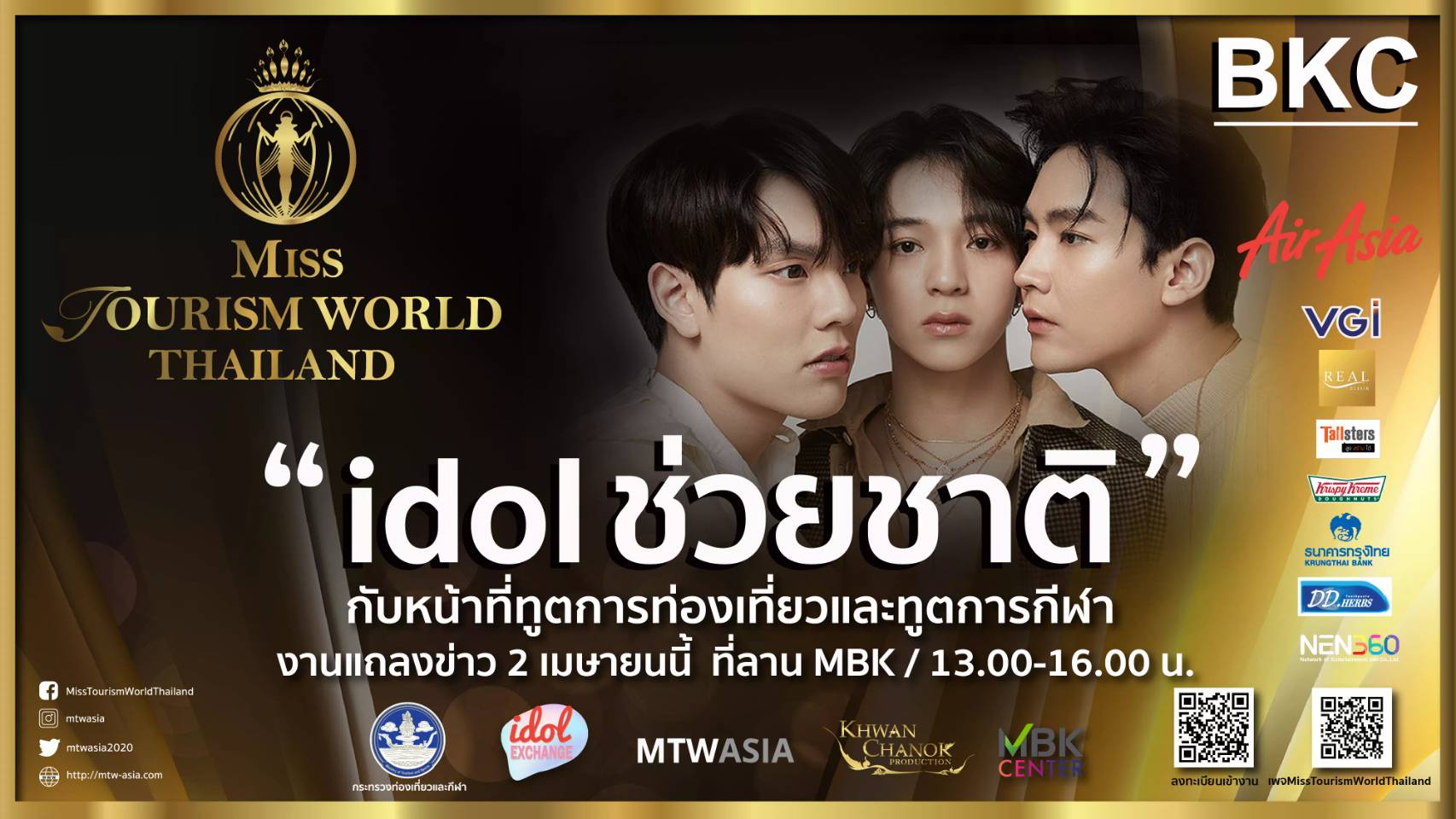 กรุงเทพมหานคร โดย สำนักวัฒนธรรมกีฬา และการท่องเที่ยว, MTWASIA และ Idol Exchange จับมือสร้างความแปลกใหม่บนโลกออนไลน์ ด้วยตำแหน่งทูตการท่องเที่ยว ที่จะทำหน้าที่ช่วยเหลือภาครัฐและเอกชน เข้าถึงกลุ่มชุมชนอย่างยั่งยืน ด้วยคอนเซ็ปท์ “Idol สวยช่วยชาติ” กับโปรเจ็กต์ Miss Tourism World Bangkok 2021 เฟ้นหาสาวไทยที่มีอายุ18-28ปี มาร่วมท้าทายด้วยกิจกรรมมากมายกับกูรูคนสำคัญ เพื่อผ่านเข้ารอบ ยกระดับให้เป็นผู้ทรงอิทธิพลบนโลกออนไลน์อย่างแท้จริง พร้อมรับสายสะพายอันทรงเกียรติจากผู้ว่าราชการกรุงเทพมหานคร ผู้อำนวยการสำนักวัฒนธรรมกีฬาและการท่องเที่ยว รองผู้ว่ากรุงเทพมหานคร ให้เป็นทูตการท่องเที่ยวและทูตการกีฬาประจำ50 เขต 50 คนของกรุงเทพมหานคร